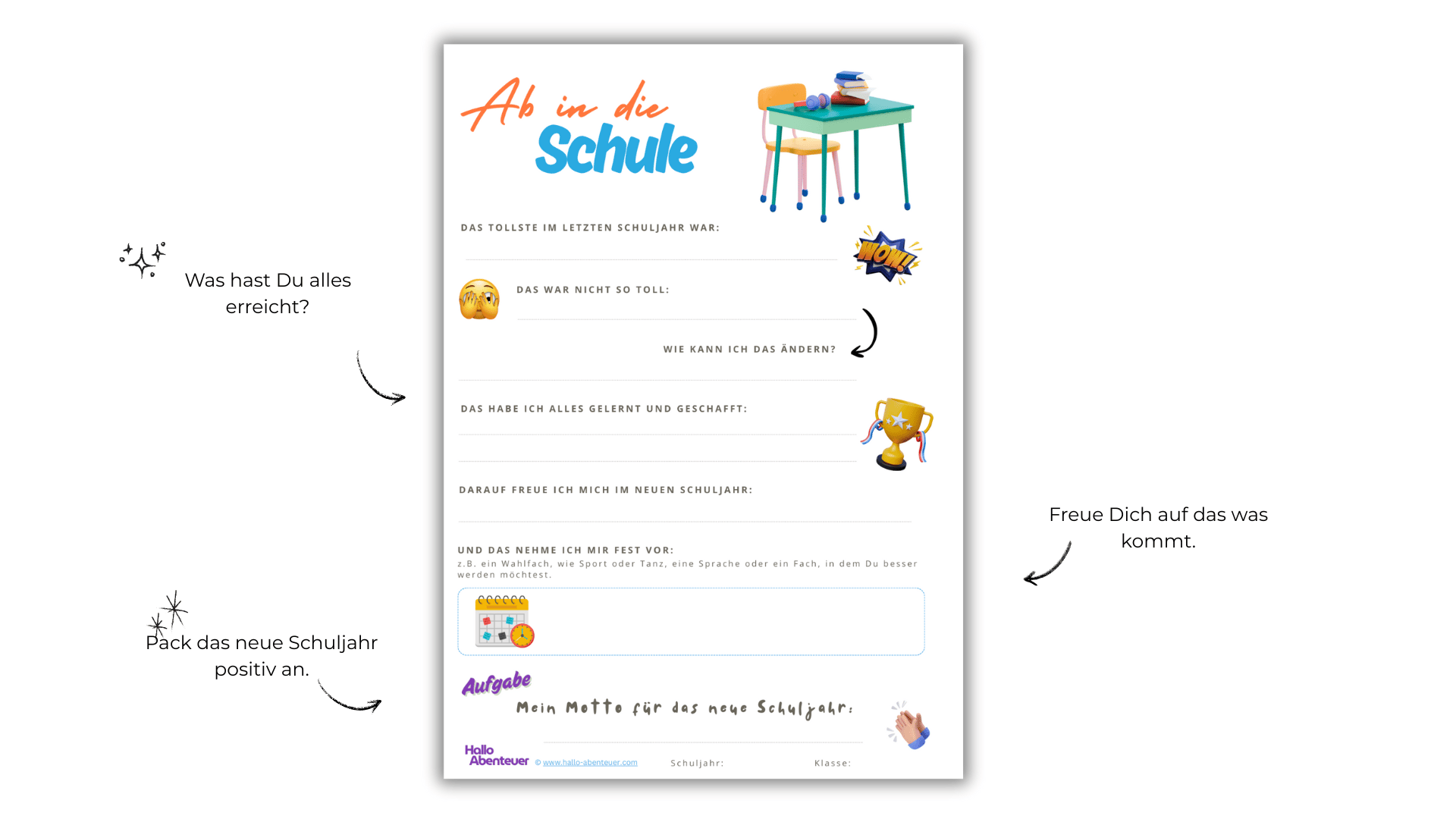 Unser Erlebnisblatt „Ab in die Schule“ hilft Kindern (und Eltern), das alte Schuljahr mit einem guten Gefühl abzuschließen und mit Motivation ins neue zu starten. Gemeinsam wird reflektiert: Was war toll? Was habe ich gelernt? Worauf freue ich mich? Und welches Motto nehme ich mit?