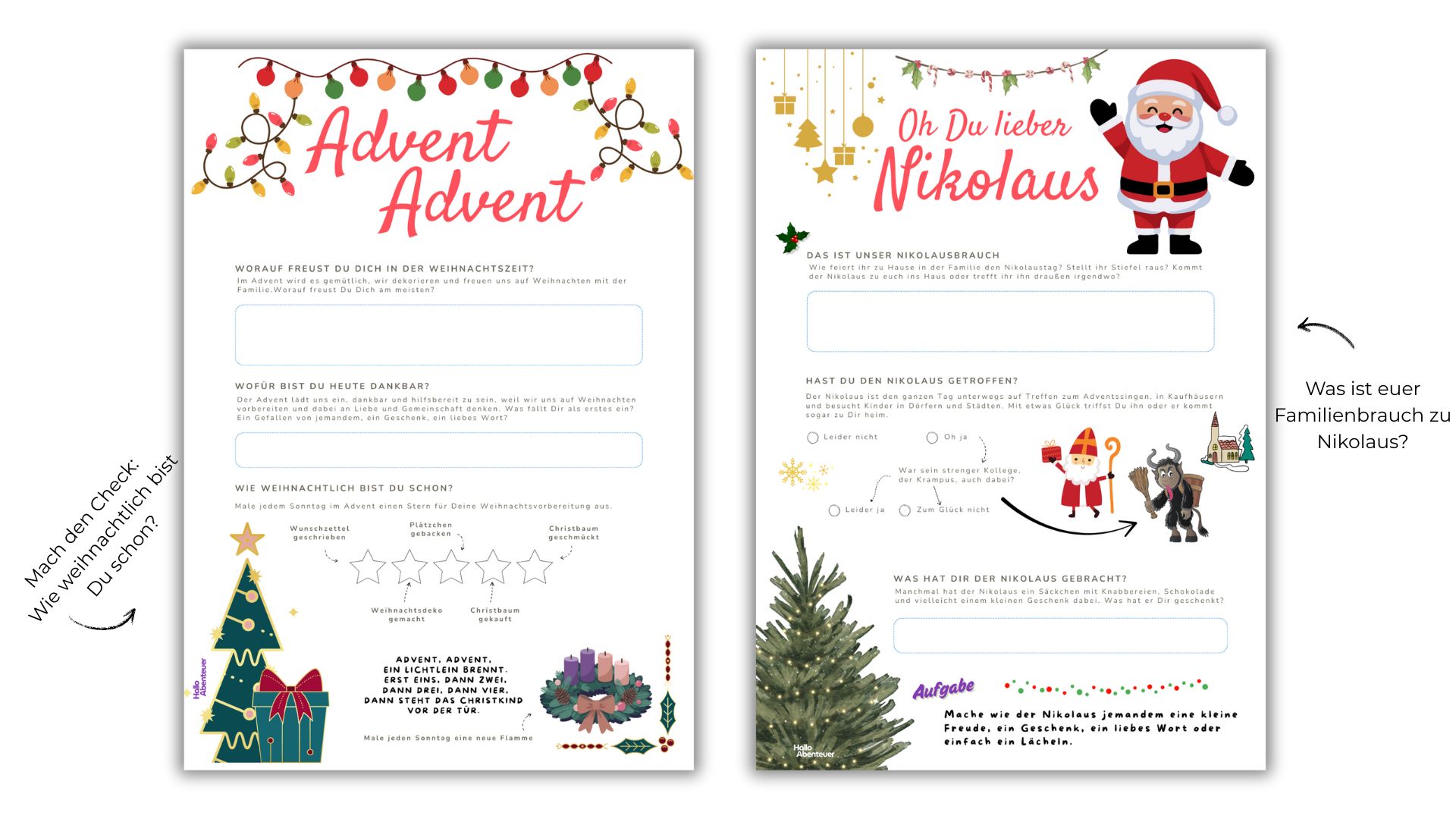 Mit diesem Erlebnisblatt könnt ihr festhalten, was euch am Advent am meisten begeistert: Wofür seid ihr dankbar? Was möchtet ihr unbedingt erleben? Und wie sehr steigt eure Weihnachtsstimmung von Tag zu Tag?