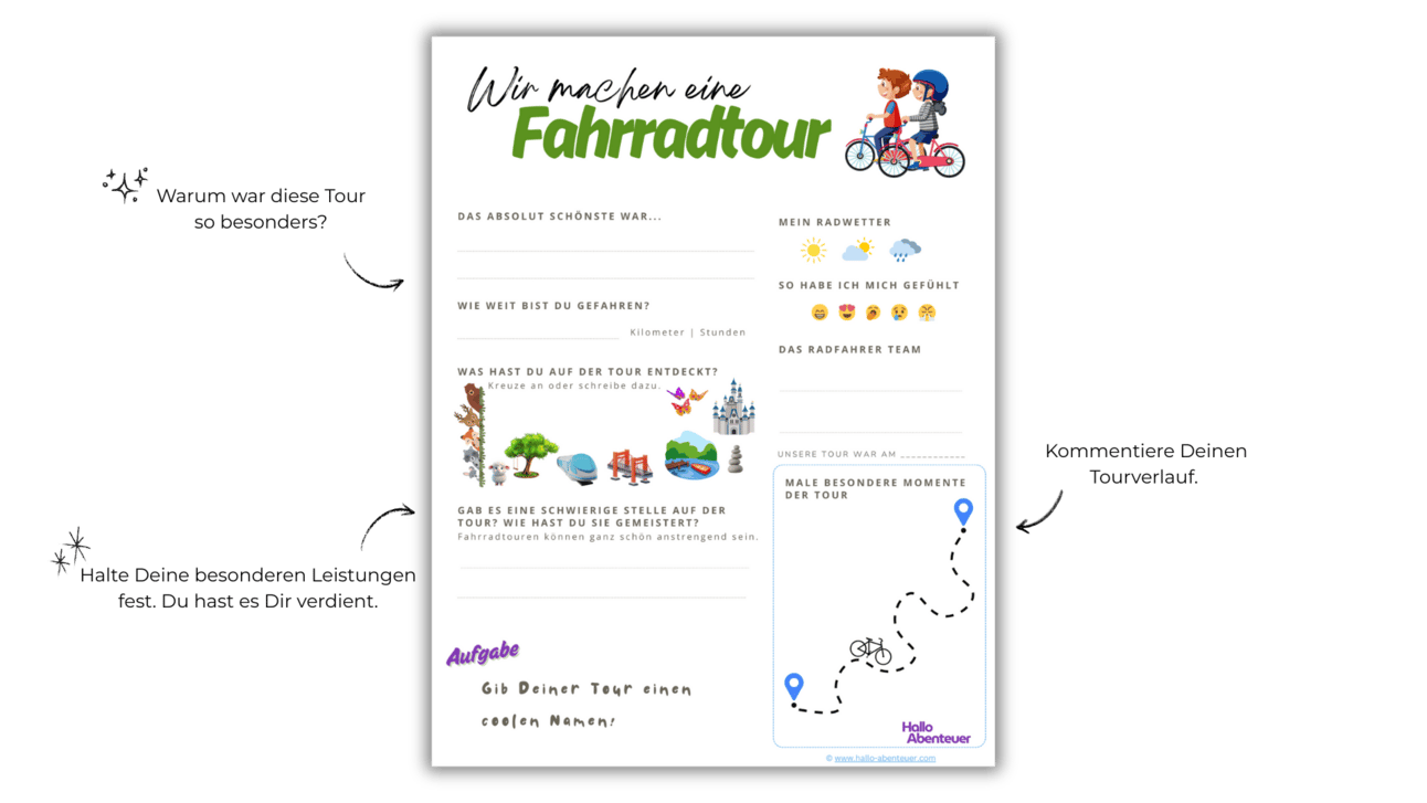 Ladet das Erlebnisblatt herunter und radelt los. Vergesst nicht eurer Tour einen coolen eigenen Namen zu geben.