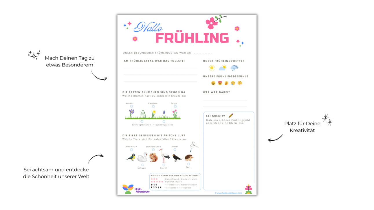 Ladet das Erlebnisblatt herunter und macht euch auf eine spannende Entdeckungsreise – der Frühling wartet auf euch! 🌼