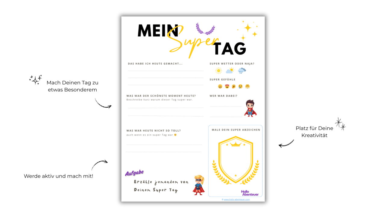 Mit unserem Erlebnisblatt "Mein Supertag" laden wir euch und eure Kinder ein, die schönsten Momente bewusst wahrzunehmen und festzuhalten. Reflektiert gemeinsam, was euren Tag besonders gemacht hat, welche Menschen ihn mit euch geteilt haben und warum ihr dankbar seid, diese Erlebnisse gehabt zu haben.