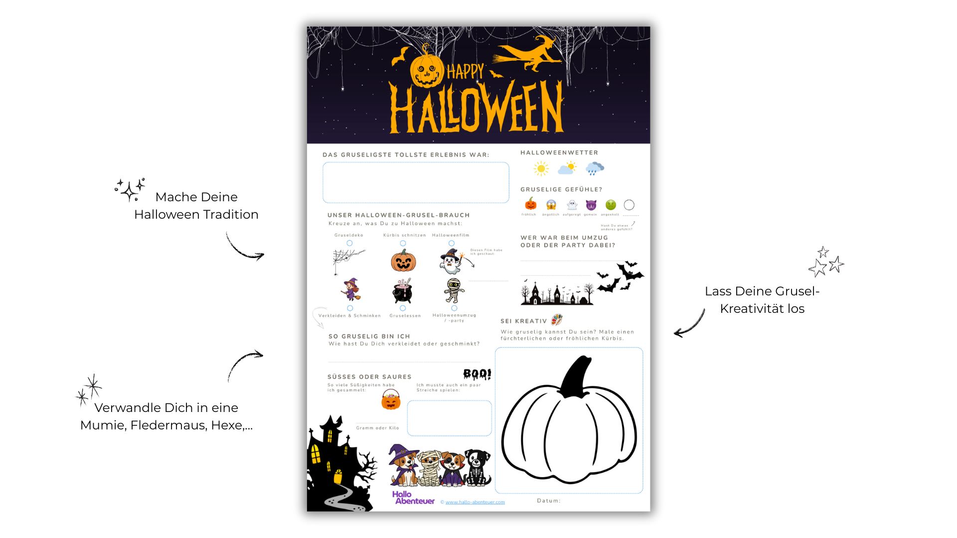 Mit unserem Erlebnisblatt „Happy Halloween“ schafft ihr euren persönlichen Familien-Halloween Brauch. 👻