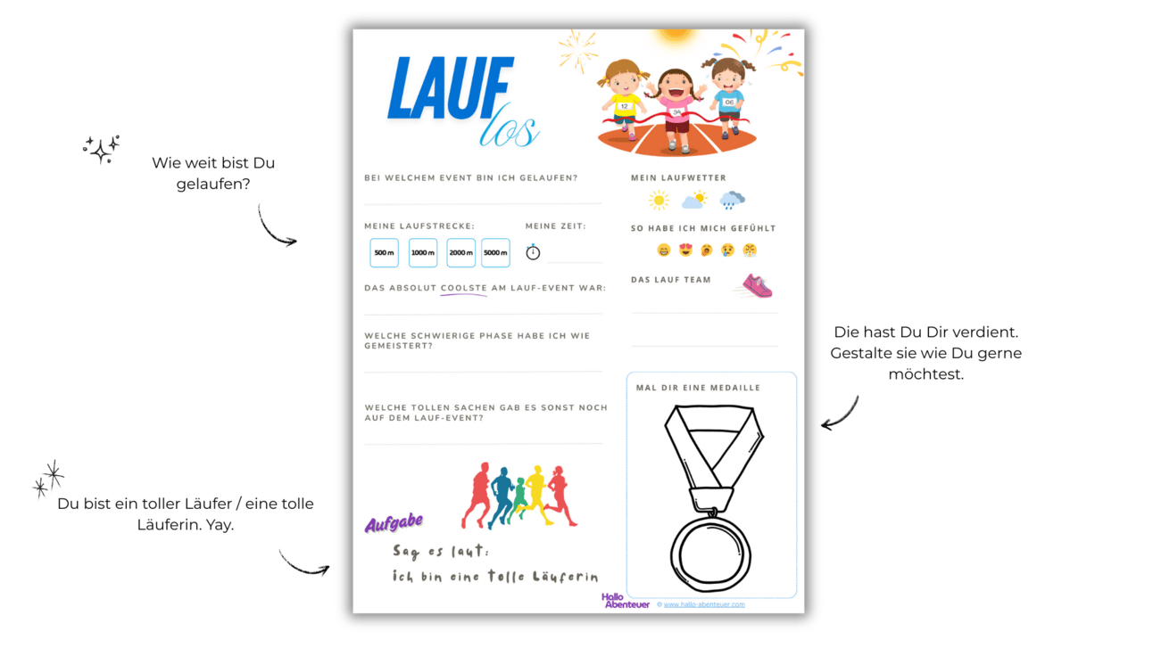 Malt gemeinsam aus, schreibt eure Gedanken nieder und schafft so eine wertvolle Erinnerung an euer gemeinsames Laufabenteuer.