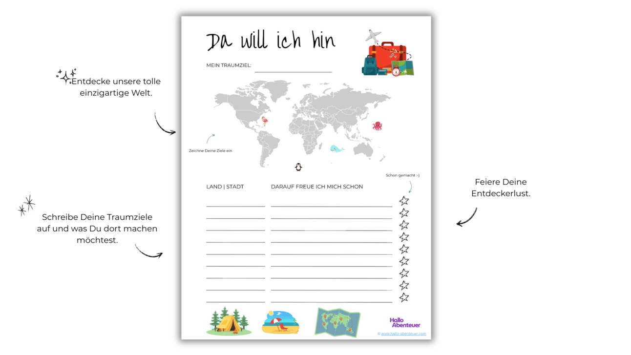 Mit dem Erlebnisblatt “Da will ich hin” sammeln wir Reiseträume, die uns spontan einfallen oder schon lange Sehnsuchtsziel sind. Die Bucketlist erinnert uns daran, dass draußen das Abenteuer auf uns wartet.